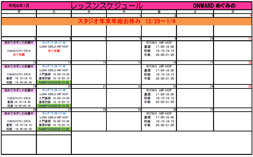 レッスン時間並びにインストラクターは予告なく変更、休講になる場合があります。